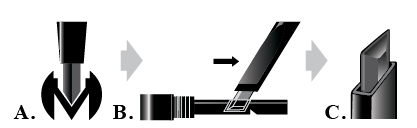 Cómo afilar la punta del lápiz: A. Coloca la punta del lápiz dentro de la ranura en V del afilador. B. Desliza suavemente en una dirección. C. Afila el lápiz cuando sea necesario para mantener mejores resultados. Limpia el afilador con un paño húmedo después de cada uso.